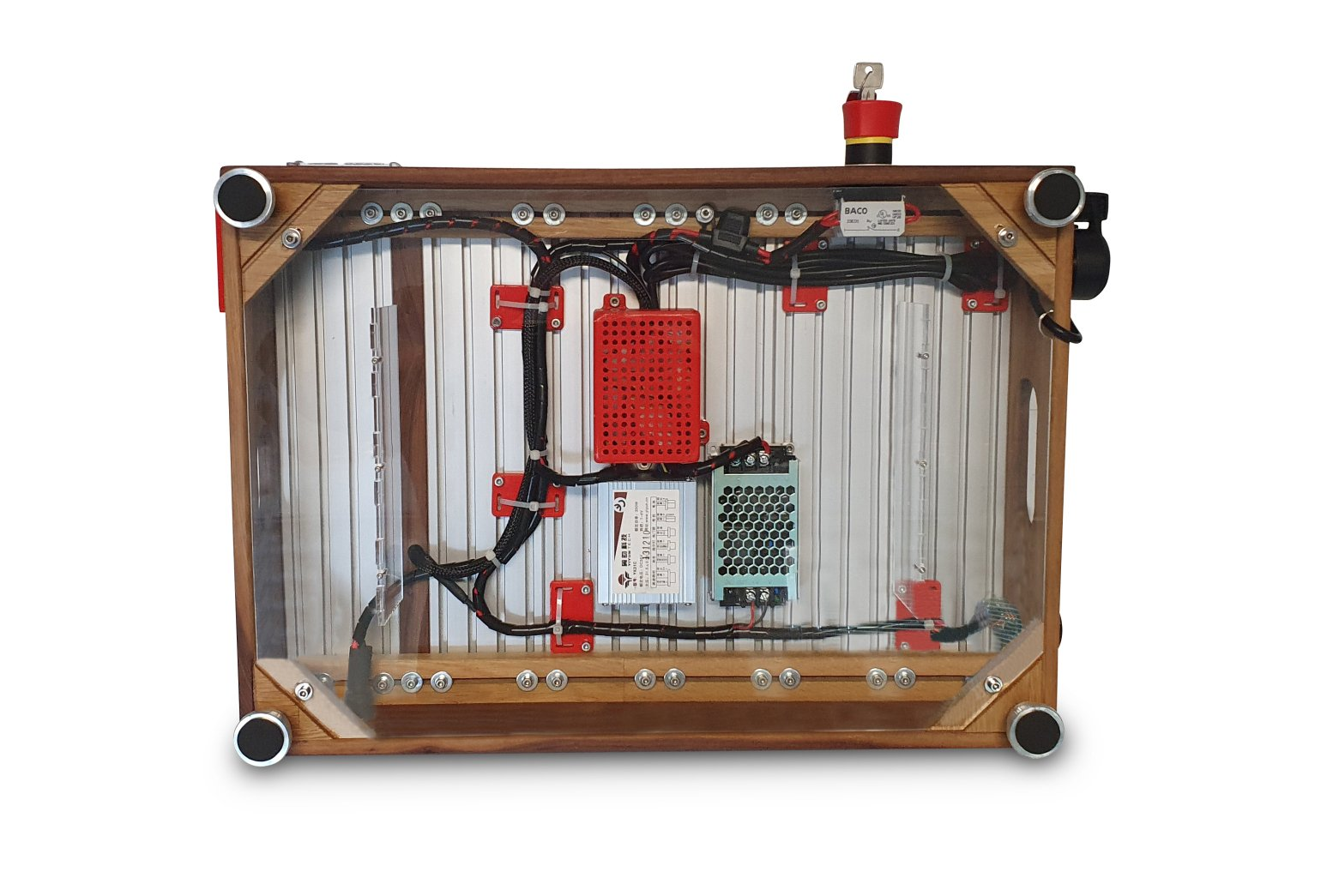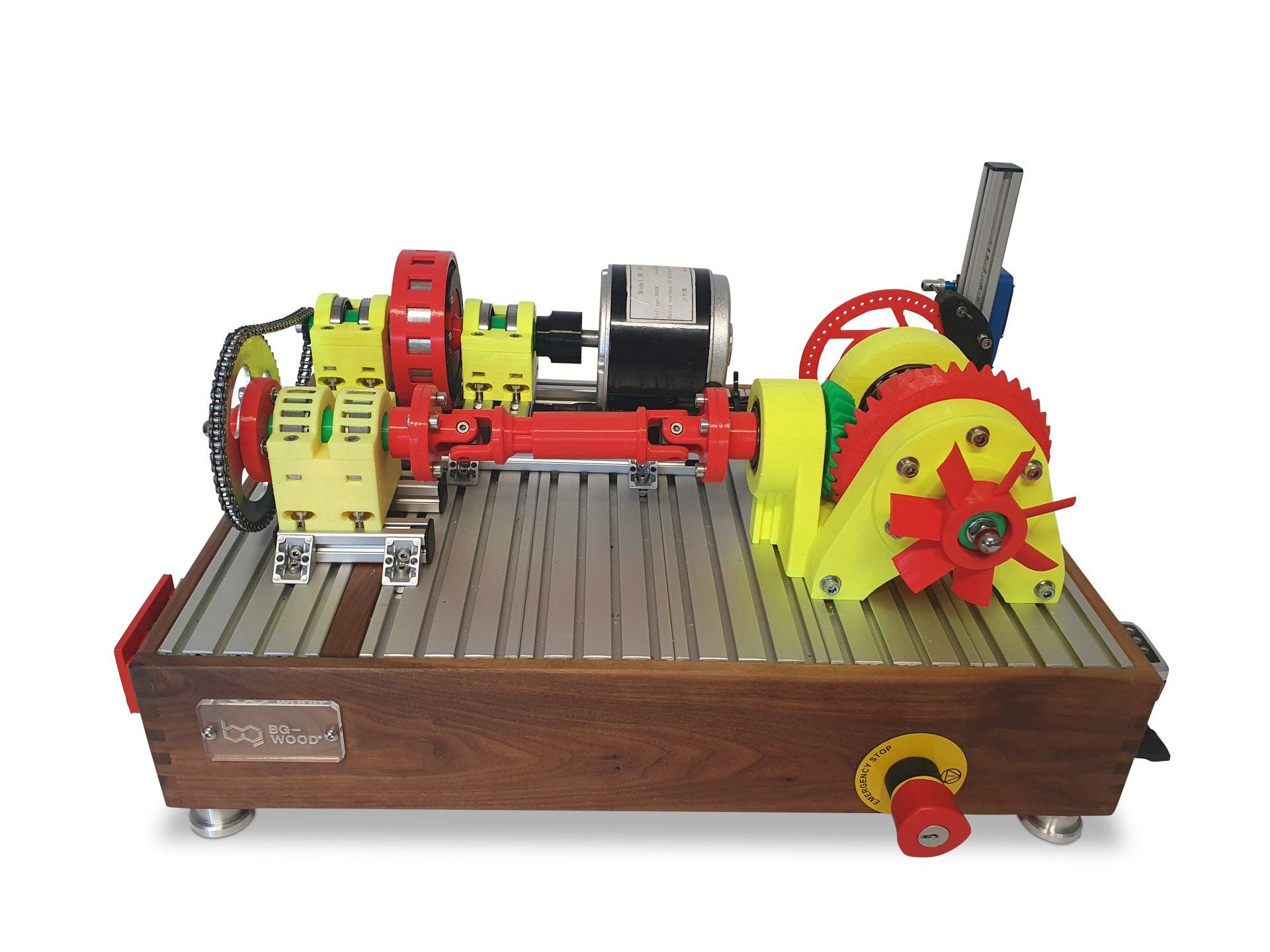 Mit Hilfe von ITEM-Profieltechnik werden die einzelnen Komponenten auf dem Unterbau plaziert. Der Motor treibt eine Fliehkraftkupplung an, welche über einen Kettentrieb und eine Kardanwelle das Differential antreibt. Eine Differentialwelle kann gebremst werden, auf der anderen sitzt ein Lüfterrad zur Verdeutlichung der Drehzahlen.