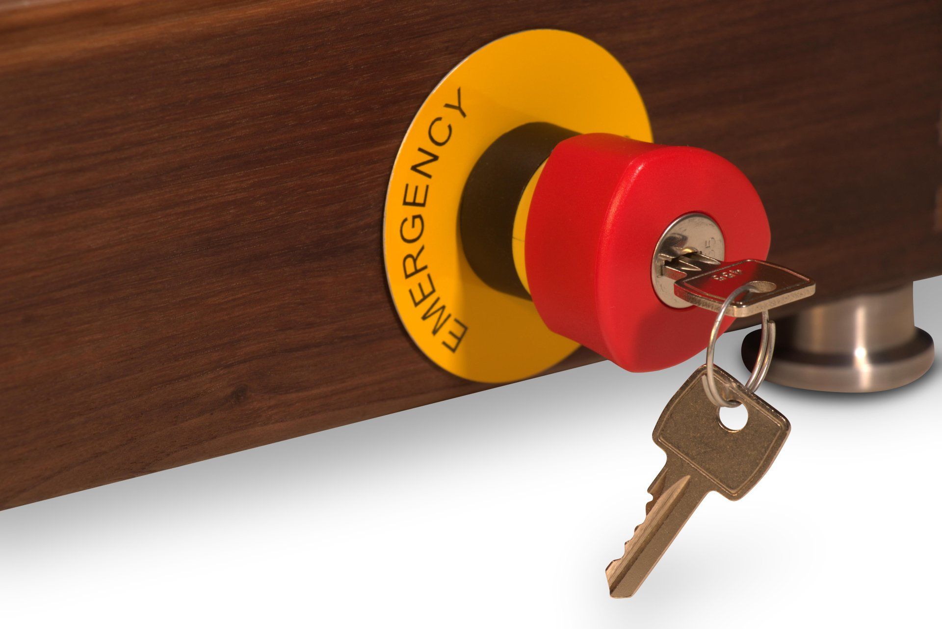 Unsere Produkte weisen einige Sicherheitsmechanismen auf. Zum einem besitzen unsere Systeme einen Notausschalter mit Schlüssel, wodurch ein unbefugtes Inbetriebnehmen verhindert wird. Des Weiteren gibt es eine duch zwei Kontaktschalter gesicherte Schutzhaube, sowie eine Abdeckung der Elektronik.